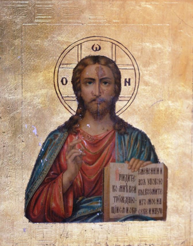 Ο Κύριος εικονίζεται σε προτομή, σε αυστηρά μετωπική στά­ση, στον τύπο του Πα­ντοκράτορα. Με το δεξί χέρι ευλογεί και με το αριστερό κρα­τάει ανοιχτό κώδικα ευ­αγγελίου, στον οποίο είναι αναγραμμένο σε ρωσική γλώσσα με μεγαλογράμματη γραφή ευαγγελικό χωρίο. Φοράει ροδοκόκκινο χιτώνα με χρυσό σιρίτι και γαλαζοπράσινο ιμάτιο, με χρυ­σοκόσμητη ταινία στην παρυφή του. Το κεφάλι του πλαι­σι­ώνει έν­σταυρος φωτοστέφανος, που ορίζεται με διπλή γραμμή, με την τυπι­κή επιγραφή Ο ΩΝ στις κεραίες του σταυρού. Η μορφή του Σωτήρος Χριστού απεικονίζεται πάνω σε χρυσό κάμπο. Στην πίσω πλευρά της εικόνας αναγράφεται με μικρογράμματη ιδιόχειρη γραφή η επιγραφή: «Ἐνθύμιον ιερόν ἐκ τῆς Ἁγίας πόλεως Ἱερουσαλήμ. Δράμα 6 8/βρίου 1906. † ὁ Δράμας Χρυσόστομος».