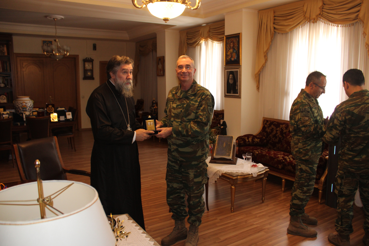 Ο Σεβασμιώτατος υποδέχθηκε εγκαρδίως τον Διοικητή της 1ης Στρατιάς και τη συνοδεία του, επικαλέστηκε την παρά Θεού ενίσχυση και ευλογία στην επιτέλεση των υψηλών και ευθυνοφόρων καθηκόντων του, και του χάρισε εις αγαθή ανάμνηση και ευλογία την ιερά εικόνα της Παναγίας Πονολυτρίας και διάφορα πνευματικά βιβλία από τις εκδόσεις της Ιεράς Μητροπόλεως.