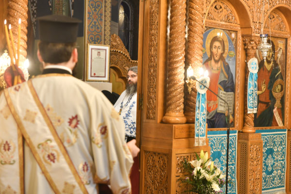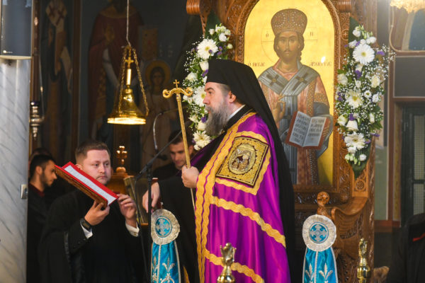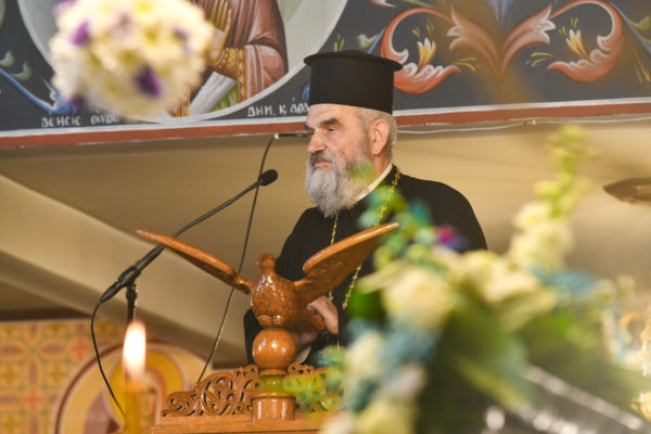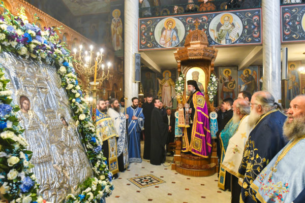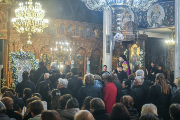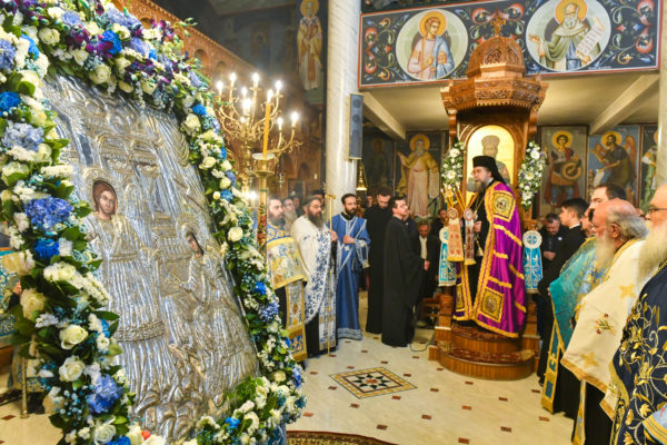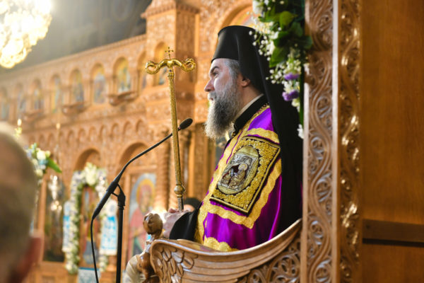 Προ της απολύσεως της ιεράς ακολουθίας του Εσπερινού, ο Σεβασμιώτατος, ευχήθηκε σ’ όλους έτη πολλά, ευλογημένα και παναγιοσκέπαστα, επικαλέσθηκε δε την κραταιά προστασία και σκέπη της μεγάλης Μητέρας, Υπεραγίας Θεοτόκου, σημειώνοντας μεταξύ άλλων και τα εξής: