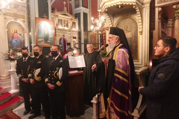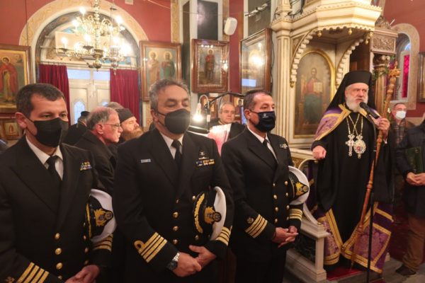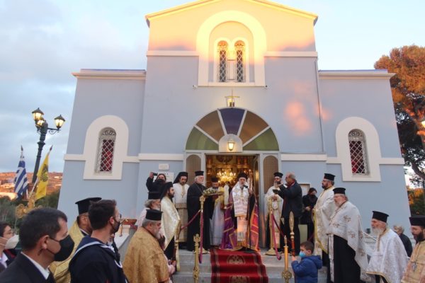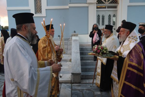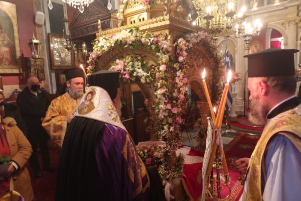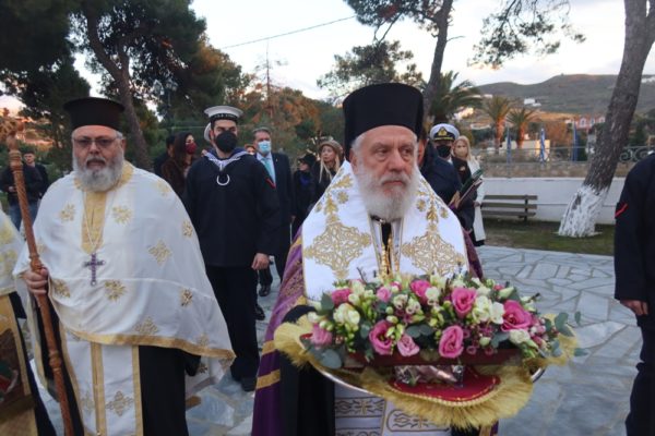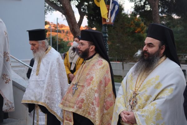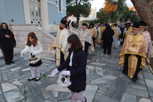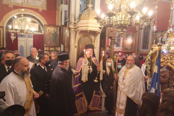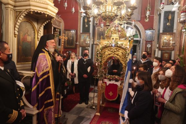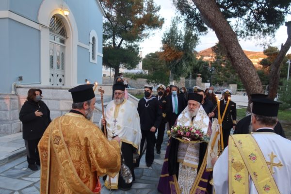 Μετά την ανάπεμψη ειδικής δοξολογικής δεήσεως στα πρόπυλα του Ναού, τελέσθηκε ο Κατανυκτικός Εσπερινός, προεξάρχοντος του Σεβασμιωτάτου κ. Δωροθέου Β΄, με την παρουσία του Δημάρχου Σύρου-Ερμούπολης κ. Νικ. Λειβαδάρα, του επικεφαλής της μείζονος μειοψηφίας του Δήμου κ. Αλέξ. Αθανασίου, της Προέδρου της Τοπικής Κοινότητος Ποσειδωνίας, Δημοτικών Συμβούλων, του Λιμενάρχη Σύρου, του Υποδιοικητού της ΠΝΒ Σύρου και ναυτοπαίδων, του Διοικητού της Ναυτικής Ακαδημίας Σύρου, του Διευθυντού των Πυροσβεστικών Υπηρεσιών, του Εισαγγελέως Εφετών, της Προέδρου Εφετών, της Προέδρου του Ιατρικού Συλλόγου, η Διευθύντρια του ΕΦΚΑ Σύρου, Εκπαιδευτικών και Μαθητών, και πολλών ευσεβών πιστών, οι οποίοι προσήλθαν, παρά το δριμύ ψύχος.