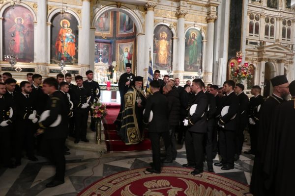 Συνεχάρη τους Σπουδαστές της Ακαδημίας Εμπορικού Ναυτικού Σύρου για την παρουσία τους, την ευγένεια και τον πολιτισμό τους, τους προέτρεψε στις δύσκολες στιγμές που θα αντιμετωπίσουν στις γέφυρες των πλοίων τους και της ζωής τους πάντοτε να στρέφουν τη σκέψη και την προσευχή τους προς τον Άγιο Νικόλαο, να επιζητούν τη βοήθειά του, με τη βεβαιότητα ότι θα βρίσκεται μαζί τους στη “βάρδια”, προστάτης και συγκυβερνήτης και τους διένειμε εικόνες του Αγίου Νικολάου.