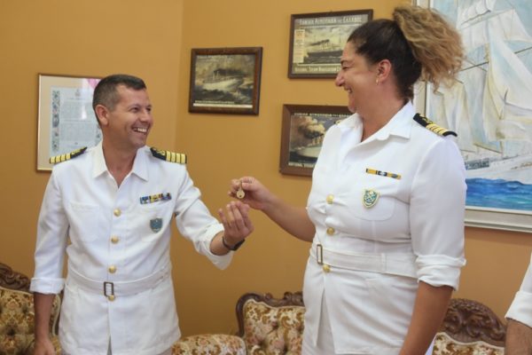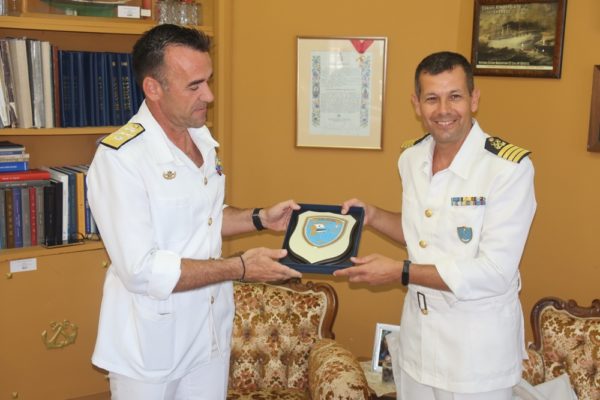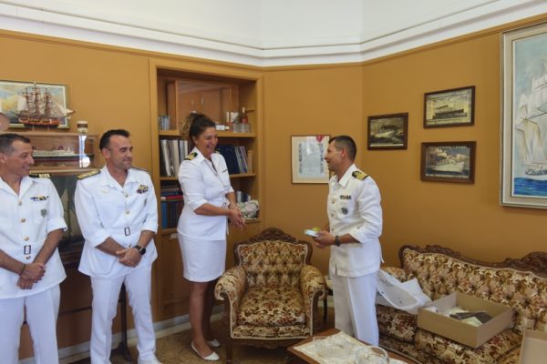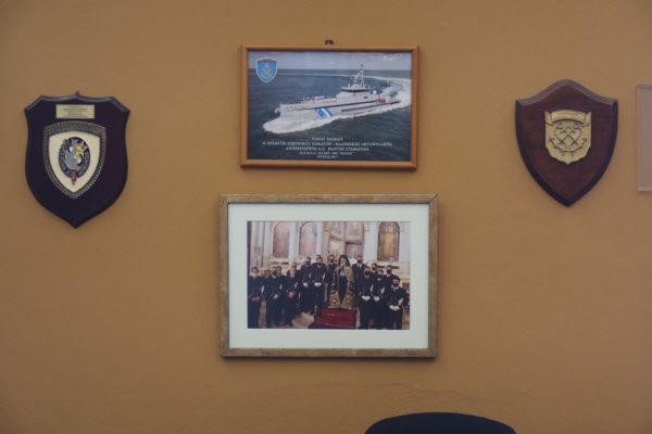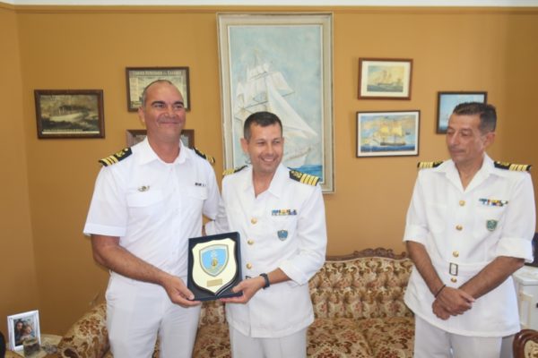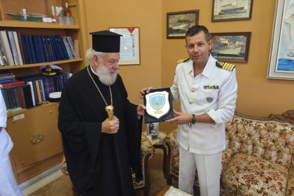 Ο αποχωρών Διοικητής κ. Παν. Καραμήτσας ευχαρίσησε με τη σειρά του τον Σεβασμιώτατο κ. Δωρόθεο Β΄ για την στήριξή του στην Ακαδημία Εμπορικού Ναυτικού Σύρου και του προσέφερε το νέο Θυρεό της Σχολής.