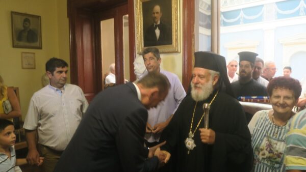 Στην Αίθουσα συνεδριάσεων του εμβληματικού και ιστορικού Δημαρχείου Ερμουπόλεως, ο Σεβασμιώτατος κ. Δωρόθεος Β’ τέλεσε την Ορκωμοσία του νεοεκλεγέντος Δημάρχου Σύρου-Ερμούπολης κ. Νικ. Λειβαδάρα και των νέων Μελών του Δημοτικού Συμβουλίου και των Τοπικών Κοινοτήτων της Σύρου, με την παρουσία του ΡΚαθολικού Επισκόπου κ. Πέτρου Στεφάνου, του Βουλευτού Κυκλάδων κ. Φιλ. Φόρτωμα, των Πολιτευτών Κυκλάδων κ. Ι. Βλασερού και κ. Δ. Μπάιλα, του Γ. Γ. της Περιφέρειας Ν. Αιγαίου κ. Γ. Χατζημάρκου, του Χωρικού Αντιπεριφερειάρχη Κυκλάδων κ. Γ. Λεονταρίτη, Εκπροσώπων του Στρατού και των Σωμάτων Ασφαλείας, του Προέδρου του Συνδέσμου Συριανών, του διατελέσαντος Δημάρχου κ. Ιω. Δεκαβάλλα, Προέδρων τοπικών Συλλόγων και Φορέων, εκπροσώπων των τοπικών ΜΜΕ, εντύπων και ηλεκτρονικών, και πλείστων πολιτών, μεταξύ των οποίων πολλοί ιατροί, συνάδελφοι του νέου Δημάρχου.