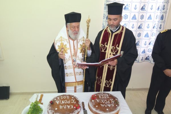Μετά από την ευγενική πρόσκληση του Διοικητού της Ναυτικής Πολεμικής Βάσης Αγκαθωπών Σύρου μετέβη σήμερα, Τρίτη 17 Ιανουαρίου 2023, ο Σεβασμιώτατος Μητροπολίτης Σύρου κ. Δωρόθεος συνοδευόμενος από τον Αρχιερατικό Επίτροπο Σύρου Πρωτοπρεσβύτερο Φλαβιανό και τον Αρχιδιάκονο π. Αντώνιο και τέλεσε κατ’ αρχάς Αγιασμό και εν συνεχεία ευλόγήσε την πίτα του Αγίου Βασιλείου.