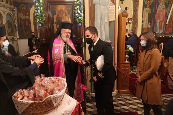 Τέλος, ευχήθηκε οι ημέρες του 2022 να είναι ημέρες αγάπης και συνεργασίας, χωρίς φόβο και με σεβασμό προς τον διπλανό μας, ευχαρίστησε τον Εφημέριο του Ναού και τους συνεργάτες του για το υπ’ αυτών επιτελούμενο έργο και διένειμε προς τους παρισταμένους την Αγιοβασιλειόπιττα, με δώρα και ευλογίες.