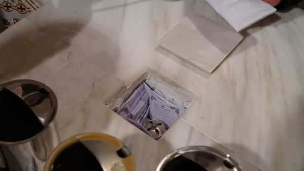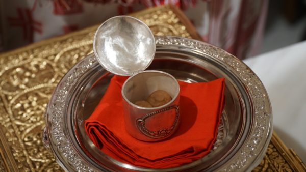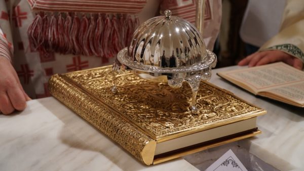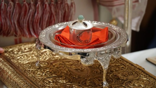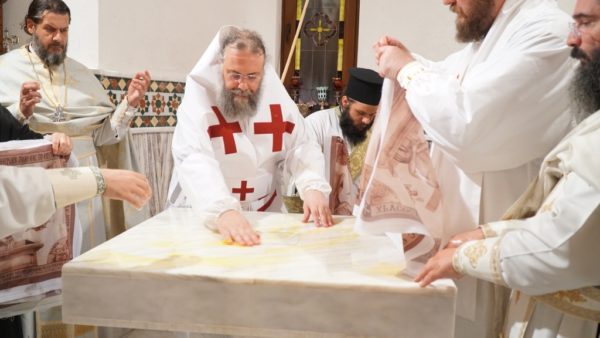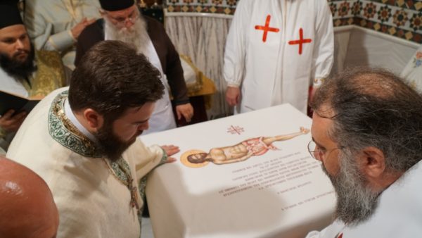 Προ της ενάρξεως της Ακολουθίας, ο Σεβασμιώτατος Μητροπολίτης Τρίκκης και Σταγών κ. Χρυσόστομος, μαζί με το Θεοφιλέστατο Επίσκοπο Πατάρων κ. Αθηναγόρα, Βοηθό του Σεβασμιωτάτου Αρχιεπισκόπου Καναδά κ. Σωτηρίου μετέφεραν στον υπό εγκαινιασμό Ιερό Ναό τα Μαρτυρικά Λείψανα τα οποία και εναπέθεσαν στην Αγία Τράπεζα τοποθετώντας τα επί του Αγίου Δισκαρίου, όπως ορίζει η εκκλησιαστική τάξη των εγκαινίων ψάλλοντας την ειδική Ακολουθία της υποδοχής των Λειψάνων η οποία περιέχει Μαρτυρικά τροπάρια εντός του Ιερού Βήματος.
