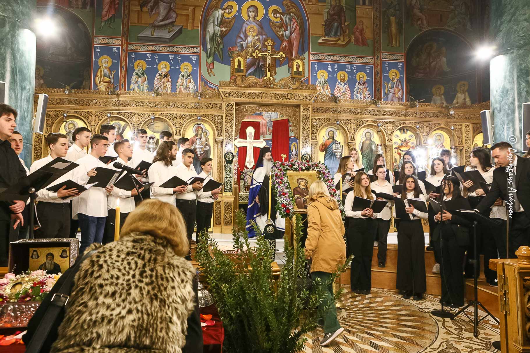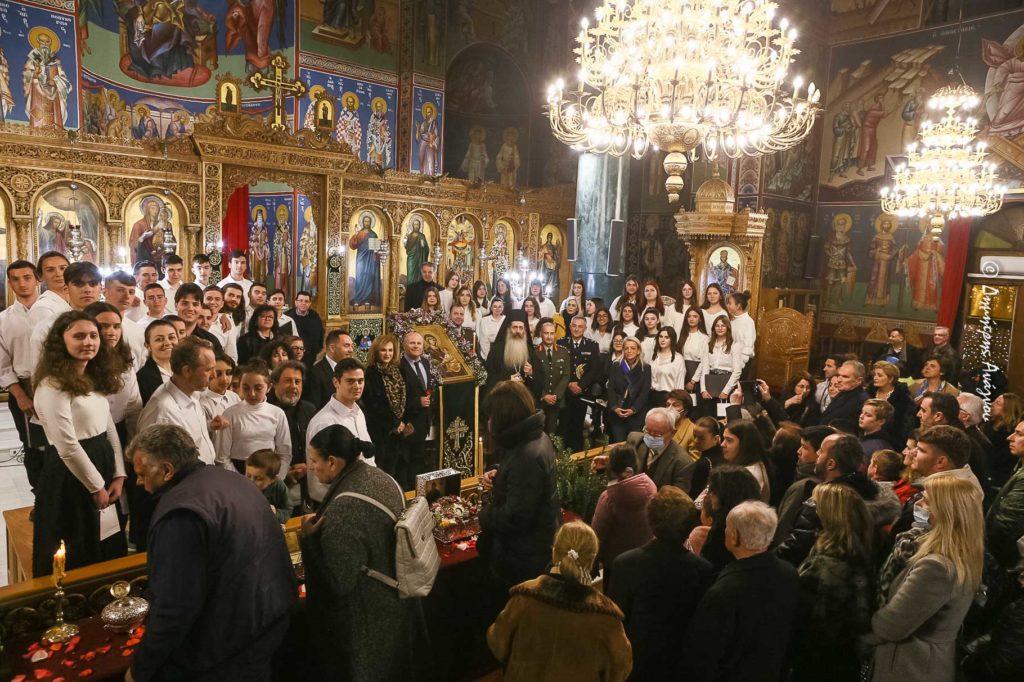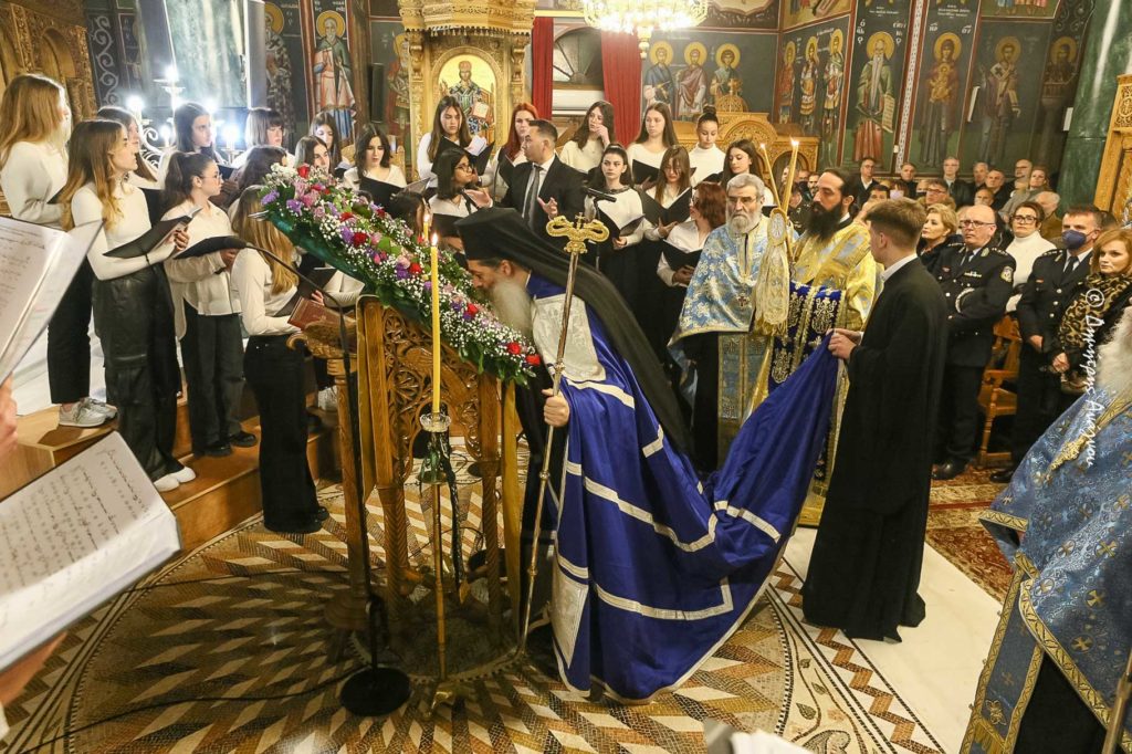 Ήλθατε απόψε, αγαπημένα μου παιδιά, να ψάλλετε στην Παναγία Μητέρα όλων μας, να ψάλλετε ύμνο και προσευχή για αυτές τις μάνες, όχι μόνο τώρα στη τελευταία τραγωδία, για αυτές τις μάνες τις χαροκαμένες, για αυτές τις μανούλες τις πονεμένες, για αυτές τις μάνες όλων μας που δακρύζουν και πονούν για μας, που υποφέρουν για όλους εμάς, ήρθατε εδώ να ψάλλετε και να προσφέρετε προσευχή και να την χαρίσετε στη μνήμη νέων ανθρώπων που έφυγαν άδικα, μάταια, γρήγορα, ανεξήγητα, ακατανόητα από αυτό τον κόσμο. Ήρθατε εδώ εσείς οι άγγελοι για να ενωθείτε με τον κόσμο των αγγέλων, ήρθατε εσείς αγαπημένα μας παιδιά για να συνομιλήσετε με τους Αγίους μας, γιατί εσείς είστε πολύ πιο κοντά στους Αγίους μας από ό,τι εμείς, εσείς είστε πολύ πιο κοντά στον Όσιο Βησσαρίωνα τον Αγαθωνίτη, αυτόν το παππούλη που αγαπούσε τα παιδιά, είστε πολύ πιο κοντά στον Όσιο Δαυίδ τον εν Ευβοία, είστε πολύ κοντά στον Όσιο Σεραφείμ από το Ζέλι, είστε πολύ κοντά στον Άγιο Ηρωδίωνα, τον πρώτο Επίσκοπο της τοπικής μας Εκκλησίας, είστε πολύ πιο κοντά στον Άγιο Νεκτάριο, ο οποίος σε δύσκολα χρόνια διωγμού και δοκιμασίας βρέθηκε στη Λαμία μας και μιλούσε στα παιδιά του τότε Γυμνασίου για αξίες και νοήματα κι έδινε κουράγιο και δύναμη σε ένα κόσμο που αναζητούσε τα πατήματά του. Εσείς είστε πολύ πιο κοντά σ όλες αυτές τις άγιες προσωπικότητες που εορτάζουν αυτές τις ημέρες.