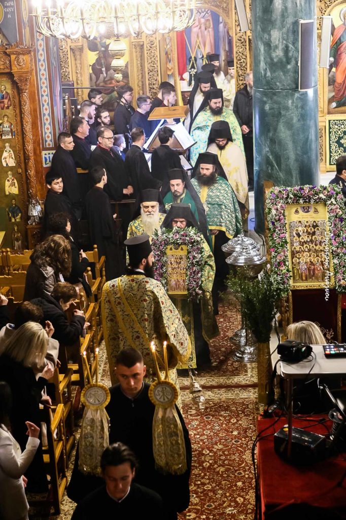 Η Ιερά Ακολουθία μεταδόθηκε απευθείας από τηλεοράσεως, ραδιοφώνου και διαδικτύου. Ο κ. Πλάτων στο εμπνευσμένο κήρυγμά του ανέφερε χαρακτηριστικά: «Με τα Ιερά Μυστήρια και τις Ακολουθίες της Εκκλησίας μας, εκφράζουμε όχι μόνο την εν Αγίω Πνεύματι ενότητά μας, αλλά τιμούμε εκείνους που έγιναν στον επίγειο βίο τους αληθινές εικόνες του Παρακλήτου και βίωσαν από το γήινο ενθάδε το εσχατολογικό επέκεινα. Η πληθωρική παρουσία των Αγίων έρχεται τελικά να εξάρει και συνοψίσει τον κύριο σκοπό της ζωής μας, που συμπίπτει απόλυτα και ευθυγραμμίζεται με τον προορισμό μας, που είναι ο αγιασμός και η θέωσή μας. Ταυτόχρονα, η καθημερινή παράταξη και πρόταξη ενώπιόν μας των Αγίων της Πίστεως από την Εκκλησία, αποσκοπεί στιο να βεβαιώνει και να τρανώσει την αλήθεια ότι εκείνοι κατόρθωσαν την αληθινή «μετάβαση» ή «αλλοίωση», για την οποία ομιλεί ο Μέγας των Εθνών Απόστολος Παύλος.