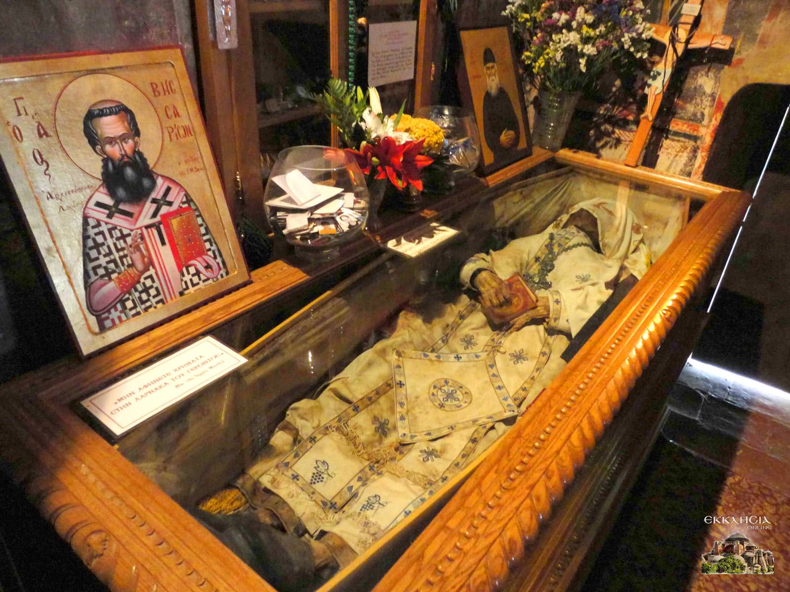 Η σορός του μεταφέρθηκε στο Μονή Αγάθωνος, αλλά εξαιτίας της σφοδρής κακοκαιρίας που επικρατούσε εκείνη την περίοδο δεν μπορούσε να ενταφιαστεί στο κοιμητήριο και τελικά κηδεύτηκε στα Βαπτιστήρια. Όταν έπειτα από χρόνια έγινε η εκταφή του λόγω καθίζησης στην ανατολική πλευρά του Μοναστηριού, το φέρετρό του βρέθηκε σε άριστη κατάσταση. Οι μοναχοί το μετέφεραν στο κοιμητήριο για να αφαιρέσουν τα οστά του γέροντα, αλλά όταν άνοιξαν το καπάκι είδαν με έκπληξη ότι το σώμα του ήταν άφθαρτο. Το άφθαρτο σώμα του Γέροντα μεταφέρθηκε στο παρεκκλήσιο της Αγίας Τριάδας για να προστατεύεται και έκτοτε εκεί βρίσκεται προς προσκύνηση από χιλιάδες πιστούς.