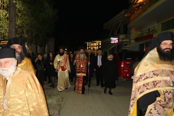 Ο Ποιμενάρχης το πρωί χοροστάτησε στον όρθρο και ακολούθως προηξήρχε της Λαμπρής Αρχιερατικής Θείας Λειτουργίας, στον περικαλλή Ναό του Αγίου, πλαισιούμενος από τον Πρωτοσύγκελλο της Ιεράς Μητροπόλεως Πανοσιολ. Αρχιμ. π. Άγγελο Ανθόπουλο, τον Προϊστάμενο του Ναού, Αιδεσιμολ. Πρτωτ. π. Αθανάσιο Μιναχείλη, πολλούς Ιερείς ομόρων Ενοριών, τον Αρχιδιάκονο της Μητροπόλεως π. Ευστάθιο Κατόπη και τον Ιεροδιάκονο π. Νικόλαο Πολυζώη.