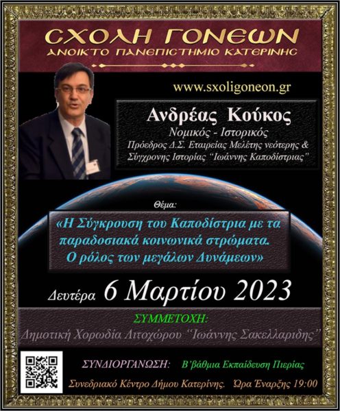 Η επόμενη εκδήλωση θα πραγματοποιηθεί την Δευτέρα 6 Μαρτίου 2023 με επίσημο ομιλητή και καλεσμένο τον Νομικό – Ιστορικό κ. Ανδρέα Κούκο και θέμα της ομιλίας του: «Η σύγκρουση του Καποδίστρια με τα παραδοσιακά κοινωνικά στρώματα. Ο ρόλος των Μεγάλων Δυνάμεων».
