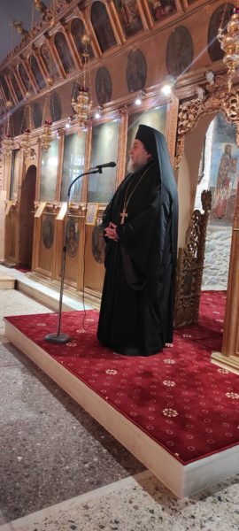 Στο κήρυγμά του ο π. Δημήτριος αφού μετέφερε σε όλους τις πατρικές ευχές του Σεβασμιωτάτου κ. Συμεών, αναφέρθηκε στο κήρυγμά του στο βίο του Αγίου Ευαγγελιστού Λουκά στο συγγραφικό του έργο και ανέπτυξε με λίγα λόγια τον στίχο εκ του Ιερού Ευαγγελίου του: «Πλὴν ἐν τούτῳ μὴ χαίρετε, ὅτι τὰ πνεύματα ὑμῖν ὑποτάσσεται· χαίρετε δὲ ὅτι τὰ ὀνόματα ὑμῶν ἐγράφη ἐν τοῖς οὐρανοῖς», σημειώνοντας με απλά λόγια, ότι ο σκοπός του πνευματικού μας αγώνα είναι η κατάκτηση της αιωνίας μνήμης. «Να μας διακρατεί αιωνίως ο Ουράνιος Πατέρας στην μνήμη του, να μας θυμάται με το όνομα που λάβαμε κατά το βάπτισμά μας, που είναι όνομα για την αιωνιότητα. Παράδειγμα τέτοιο ο Όσιος Βησσαρίων, ο οποίος αγωνιζόμενος να ζει κατά το θέλημα και τις εντολές του Θεού κατέκτησε την αιωνία μνήμη και είναι για εμάς σήμερα πρέσβης προς τον Κύριο και φωτεινός οδοδείκτης που μας κατευθύνει προς την πορεία της αγιότητος και της Βασιλείας των Ουρανών».