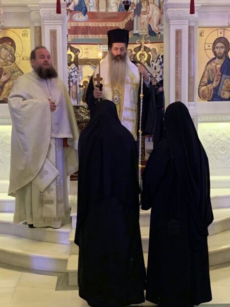 Στην σύντομη προσλαλιά του ο κ. Συμεών μετέφερε τις πατρικές ευχές και ευλογίες του κοινού πνευματικού πατέρα μας, Αρχιεπισκόπου Αθηνών και πάσης Ελλάδος κ. κ. Ιερωνύμου και συνεχάρη την νέα Καθηγουμένη της Μονής, γερόντισσα Θεοφανώ και την αδελφότητα, γι’ αυτό το νέο πνευματικό καρπό της Μονής, που είναι η μοναχή Στυλιανή η νεότερη.