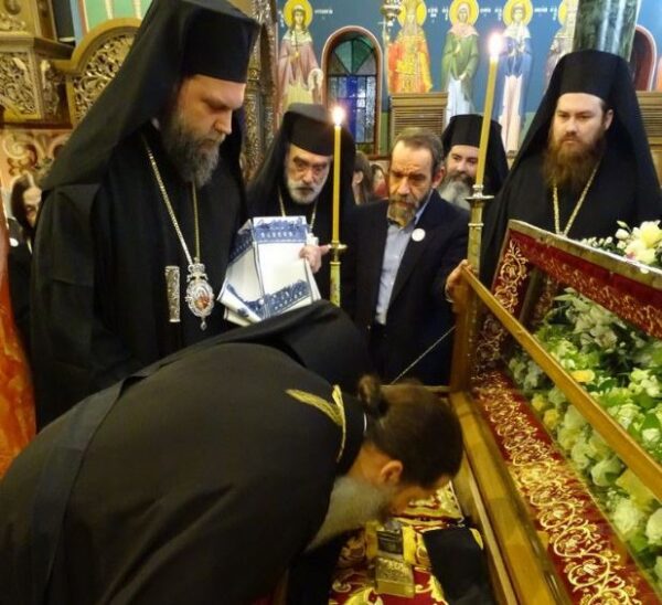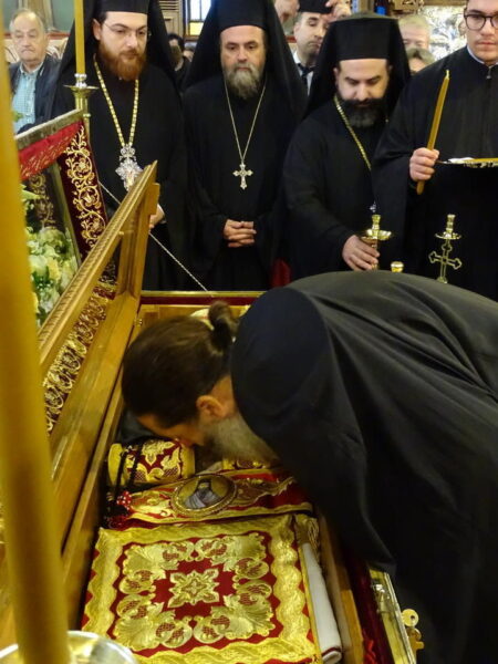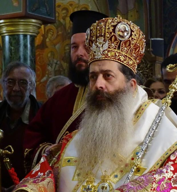 Στην πανήγυρή μας φέτος, φιλοξενούμε υψηλά πρόσωπα, δύο υψηλούς επισκέπτες, δύο αδελφούς Αρχιερείς. Τον προεξάρχοντα σήμερα στην Ευχαριστιακή Σύναξη, Σεβασμιώτατο Μητροπολίτη Φθιώτιδος κ. Συμεών και τον χοροστατούντα χθές στον Εσπερινό Σεβασμιώτατο Μητροπολίτη Καλαβρύτων και Αιγιαλείας κ. Ιερώνυμο. Τους ευχαριστώ και τους δύο και τους καλωσορίζω μέσα πα’ την καρδιά μου στην προσφυγική αυτή Μητρόπολη.