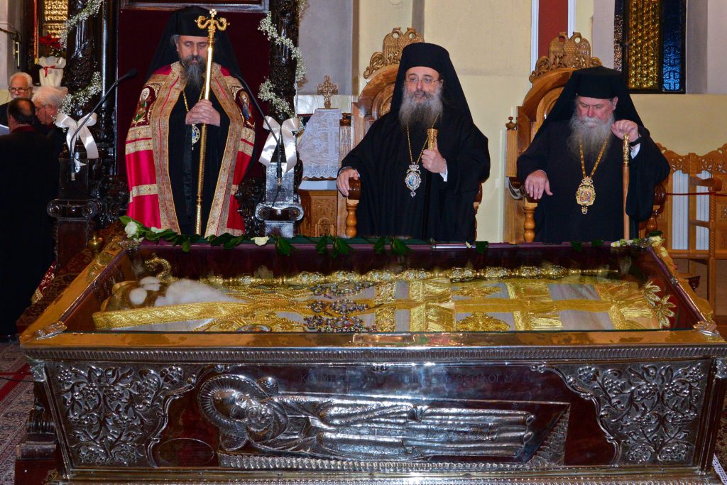 Τιμητική συνοδεία του Αγίου η χορεία των ιεραρχών, ο ιερός Κλήρος, ο Δήμαρχος Καβάλας κ. Θεόδωρος Μουριάδης ο Αντιπεριφεριεάρχης Καβάλας κ. Αλέξης Πολίτης, η βουλευτίς Καβάλας κ. Τάνια Ελευθεριάδου, δημοτικοί και περιφερειακοί σύμβουλοι, μαζύ με τους πολυαρίθμους προσκυνητές και χριστιανούς της τοπικής κοινωνίας και των περιχώρων.