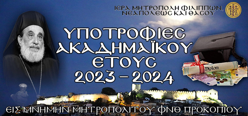 Από την Ιερά Μητρόπολη Φιλίππων, Νεαπόλεως και Θάσου ανακοινώνεται, ότι, με απόφαση του Σεβασμιωτάτου Μητροπολίτη κ. Στεφάνου, και σύμφωνα με τα όσα ορίζονται στην ιδιόγραφη διαθήκη του μακαριστού Μητροπολίτου Φιλίππων, Νεαπόλεως και Θάσου κυρού Προκοπίου, προκηρύσσεται για το ακαδημαικό έτος 2023-2024 η χορήγηση 15 υποτροφιών σε προπτυχιακούς φοιτητές με οικονομικές δυσκολίες, οι οποίοι εισήχθησαν φέτος στα Ανώτατα Εκπαιδευτικά Ιδρύματα της Ελλάδος και κατάγονται από τις επαρχίες της Μητρόπολης και διαμένουν μόνιμα εντός των ορίων αυτής.