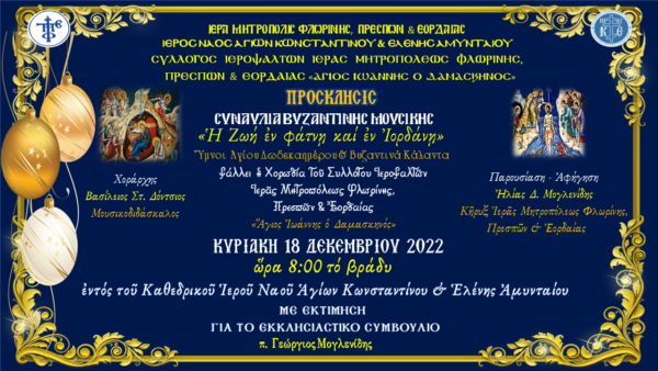 Θα ακουστούν Ύμνοι Αγίου Δωδεκαημέρου & Βυζαντινά Κάλαντα τους οποίους ψάλλει η χορωδία του Συλλόγου Ιεροψαλτών Ιεράς Μητροπόλεως Φλωρίνης, Πρεσπών & Εορδαίας «Άγιος Ιωάννης ο Δαμασκηνός»