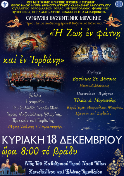 Την Κυριακή 18 Δεκεμβρίου στις 8 το βράδυ, εντός του Καθεδρικού Ιερού Ναού Αγίων Κωνσταντίνου & Ελένης Αμυνταίου, θα λάβει χώρα η συναυλία Βυζαντινής Μουσικής με τίτλο: «Η Ζωή εν φάτνη και εν Ιορδάνη»