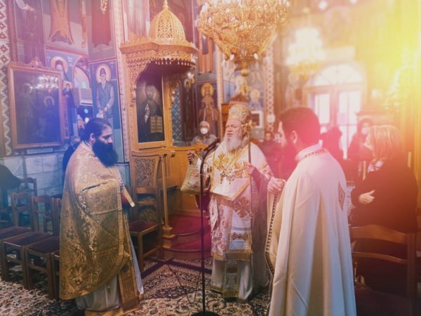 Μετά την απόλυση της Θείας Λειτουργίας, ο Σεβασμιώτατος, με ορισμένους εκ των εκκλησιασθέντων πιστών, τέλεσε τρισάγιο επί του τάφου του μακαριστού Μητροπολίτου.