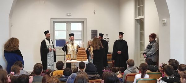 Μετά την απόλυση της Θείας λειτουργίας, ο Σεβασμιώτατος, συνοδευόμενος από τους παραπάνω Κληρικούς, επισκέφθηκε, κατόπιν προσκλήσεως το 3ο Δημοτικό Σχολείο Χαλκίδος, όπου τέλεσε αρτοκλασία, που είχε ετοιμάσει η σχολική κοινότητα και μίλησε στους μαθητές για την συμβολή των τριών Ιεραρχών στην εκπαίδευση και την ελληνική γλώσσα.