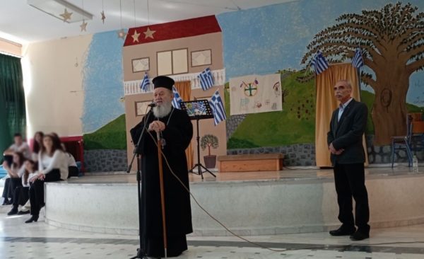 Στην προσφώνηση της, η Διευθύντρια ευχαρίστησε τον Σεβασμιώτατο, για την παρουσία του και αναφέρθηκε εν συντομία στο ιστορικό της Απελευθέρωσης και στο σωτηριώδες μήνυμα του Ευαγγελισμό της Θεοτόκου, που ενέπνευσε, ενδυνάμωσε και ατσάλωσε την θέληση των Ελλήνων για ελευθερία. Οι μικροί μαθητές της Ε΄ Δημοτικού, μέσα από τραγούδια και δρώμενα, που είχαν επιμεληθεί οι Εκπαιδευτικοί κ. Αικατερίνη Ανδρεοπούλου και Παναγιώτα Κακαρά, παρουσίασαν τα γεγονότα της Εθνικής μας παλιγγενεσίας από την άλωση της Πόλης μέχρι την απελευθέρωση της Ελλάδας.