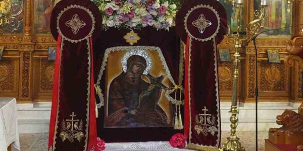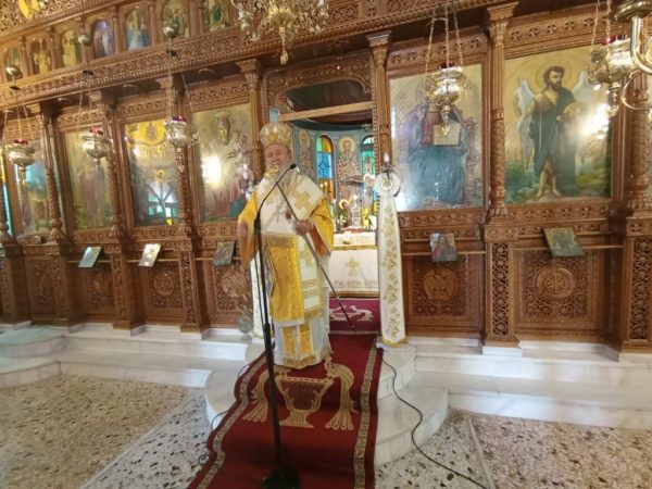 Ο Σεβασμιώτατος, στο κήρυγμά του, ανέφερε την ιστορία του ιερού εικονίσματος, το οποίο είναι ένα θησαύρισμα του προσφυγικού χωριού Ταξιάρχης, σπάνιο στην τέχνη της αγιογραφίας. Η μεγάλη μας μάνα, η Παναγία, βαστά στην αγκαλιά της το Μονογενή της Υιό Εσταυρωμένο. Την εικόνα αυτή έφερε από τη Μικρασία η οικογένεια Λυμπέρη. Εκεί στην πατρίδα, στο Μουρσαλί της επαρχίας Αϊδινίου της Σμύρνης, η γιαγιά Λυμπέρη είδε στον ύπνο της την Παναγία να της λέει : – ” Έξω στην αυλή σου, στο σανίδι που ακουμπάς τη σκάφη σου και πλένεις, είμαι εγώ ζωγραφισμένη. Πάρε σαπούνι και νερό και πλύνε με”. Εκείνη δεν έδωσε σημασία και δεν έκανε τίποτα. Ξανά η Παναγία, για δεύτερη φορά της παρουσιάζεται στον ύπνο και της επαναλαμβάνει τα ίδια λόγια. Ξύπνησε τότε και άκουσε κάποια μέσα στη νύχτα να σκουπίζει την αυλή. Τρόμαξε, αλλά φοβούμενη το σκοτάδι περίμενε να ξημερώσει. Έτρεξε τότε αμέσως, πήρε το σανίδι και το έπλυνε και όντως, από κάτω εμφανίστηκε άθικτη η αγία της μορφή να κρατά τον Εσταυρωμένο Υιό της. Έτρεξε και το ανακοίνωσε στη γειτονιά. Μαζεύτηκαν τότε οι χωριανοί να την προσκυνήσουν κάνοντας λιτανεία και δεήσεις. Στην νέα πατρίδα η εικόνα της Παναγίας βρισκόταν στο σπίτι της μακαριστής Δέσποινας Καμπού, κόρης της γιαγιάς Λυμπέρη. Όποια οικογένεια είχε πρόβλημα ή ασθενή έπαιρνε την εικόνα στο σπίτι και την ξενυχτούσε και η χάρη της Παναγίας επισκεπτόταν την οικογένεια και ανακούφιζε από τα προβλήματά της. Αργότερα η εικόνα πέρασε σε συγγενείς οι οποίοι την δεκαετία του 1980 δώρισαν το 50% της εικόνας, που είχε περιέλθει στην δική τους ιδιοκτησία, στην ενορία ενώ μετά από έρανο στο χωριό αγοράστηκε το υπόλοιπο 50% και από τότε φυλάσσεται ως ανεκτίμητο ιερό θησαύρισμα στον Ιερό Ναό Αγίων Ταξιαρχών στον Ταξιάρχη Ωρεών της Βορείου Ευβοίας και λόγω της συγκεκριμένης απεικονίσεως της Θεοτόκου σχετίζεται με τον εορτασμό της Υψώσεως του Τιμίου Σταυρού και η σύναξή της τιμάται δύο ημέρες μετά. Επίσης, ο Σεβασμιώτατος συγκινημένος, επαίνεσε το εκκλησίασμα διότι, όλοι μαζί, έψαλλαν το απολυτίκια της Παναγίας του Πάθους, του Τιμίου Προδρόμου και των Αρχαγγέλων, απήγγειλαν το Σύμβολο της Πίστεως και την Κυριακή Προσευχή, αλλά και επειδή σχεδόν όλοι προσήλθαν στο Κοινό Ποτήριο και με την ευκαιρία αυτή επαίνεσε τον π. Στέφανο, για την ανύστακτη πνευματική του μέριμνα υπέρ των ενοριτών του.