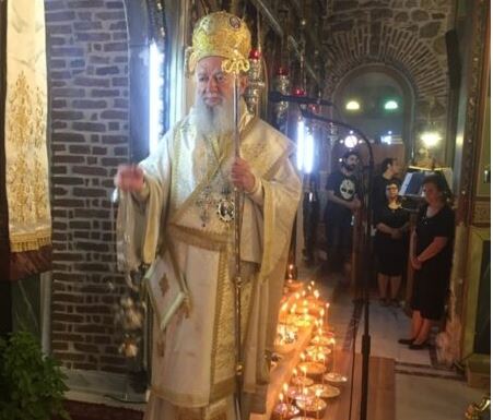Εκεί, προσέφερε την Θεία Λειτουργία, συλλειτουργούντος, εκτός των συνοδών του, και του Εφημερίου της Ενορίας Πρωτοπρεσβ. Σταματίου Μπασδέκη, κήρυξε τον θείο λόγο προς το πολυπληθές εκκλησίασμα, ενώ τέλεσε και τα μνημόσυνα των απ’ αιώνος κεκοιμημένων αδελφών μας, ενώ το Ιερό Αναλόγιο διηκόνησαν οι Ιεροψάλτες του Ι. Ναού κ. Αθανάσιος Τριανταφύλλου και κ. Αλέξανδρος Βουρής.