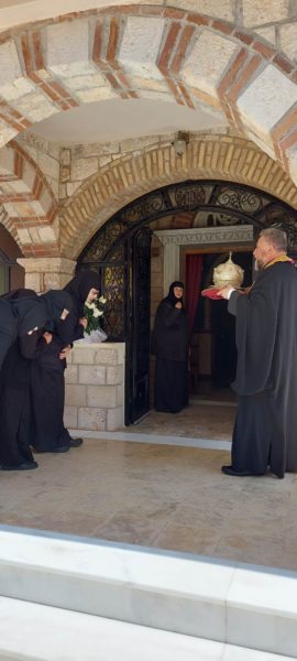 Μετά την αναχώρηση από την Ενορία των Αγίων Κωνσταντίνου και Ελένης Νέου Βυζαντίου Ναυπλίου, έγινε υποδοχή της Τιμίας Κάρας από την Αδελφότητα της Ιεράς Μονής Κοιμήσεως Θεοτόκου Καλαμίου όπου εψάλλει δέηση εντός του Καθολικού της Ιεράς Μονής.