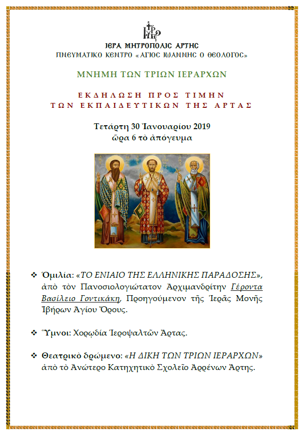 Εκδήλωση προς τιμήν των εκπαιδευτικών της Άρτας διοργανώνει η Ιερά Μητρόπολη Άρτης την Τετάρτη 30 Ιανουαρίου στις 6 το απόγευμα στο Πνευματικό Κέντρο “Άγιος Ιωάννης ο Θεολόγος”. Ομιλητής θα είναι ο Γέροντας π. Βασίλειος Γοντικάκης, ο οποίος θα αναπτύξει το θέμα: “Το ενιαίο της Ελληνικής παράδοσης”. Στην συνέχεια θα αποδοθούν ύμνοι από την χορωδία της Ι.Μ. Άρτης και στη συνέχεια θα ακολουθήσει η θεατρική παράσταση “Η δίκη των Τριών Ιεραρχών” από το Ανώτερο Κατηχητικό Σχολείο Αρρένων Άρτης.