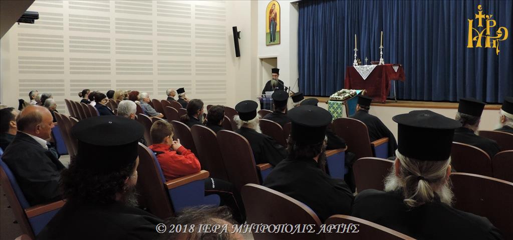 Ο Σεβασμιώτατος Μητροπολίτης Άρτης κ. Καλλίνικος, ετέλεσε τον εναρκτήριο Αγιασμό. Στην συνέχεια, ομίλησε, αναφερθείς στον λόγο του Αποστόλου Παύλου: «Ἐάν γάρ εὐαγγελίζωμαι, οὐκ ἔστι μοι καύχημα, ἀνάγκη γάρ μοι ἐπίκειται, οὐαί δέ μοί ἐστίν, ἐάν μή εὐαγγελίζωμαι» (Α΄ Κορ. θ΄, 16).