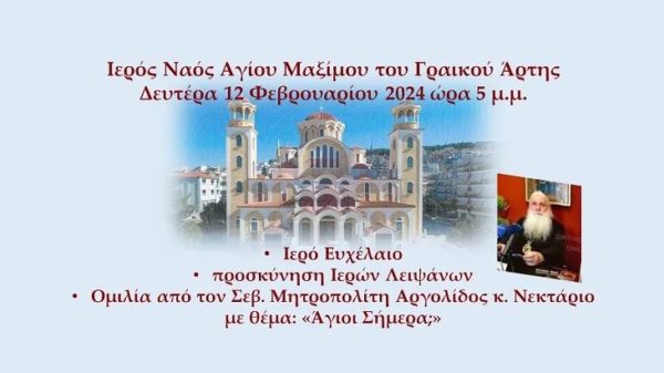 Την Δευτέρα 12 Φεβρουαρίου 2024, στις 5 το απόγευμα, στον Ιερό Ναό του Αγίου Μαξίμου του Γραικού, θα τελεσθεί το Μυστήριο του Ιερού Ευχελαίου.