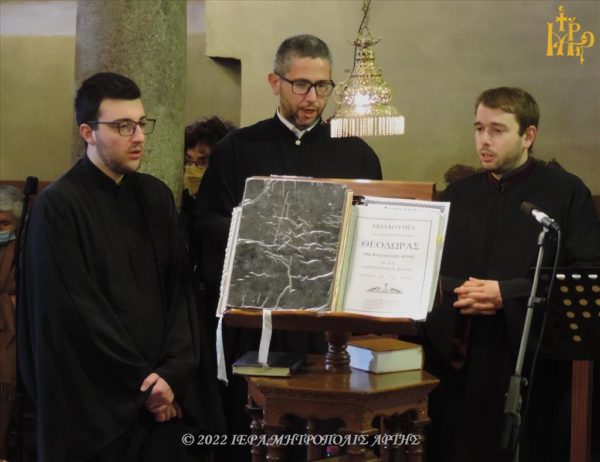 Ο Μητροπολίτης Άρτης κ. Καλλίνικος ευχαρίστησε τους συμπανηγυρίζοντες Αγίους Αρχιερείς. Εν συνεχεία ο Μητροπολίτης Θεσσαλιώτιδος και Φαναριοφερσάλων κ. Τιμόθεος κήρυξε τον Θείο λόγο και ανεφέρθηκε περιεκτικά στον βίο της εορταζούσης Αγίας Θεοδώρας και στην υπομονή της, επικαλούμενος τη χάρη και τη σκέπη της, για τον λαό της Άρτας και όλης της Ηπείρου.