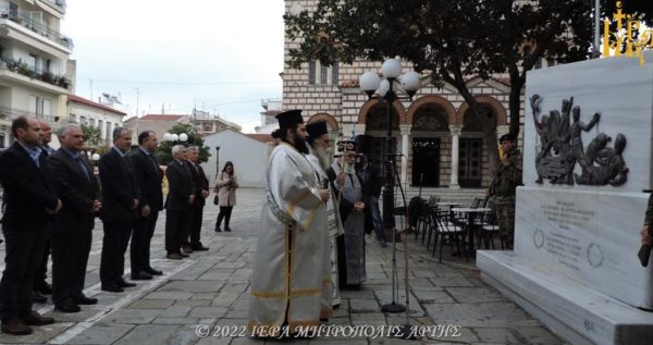 Στην συνέχεια, στο μνημείο της Εθνικής Αντίστασης, το ευρισκόμενο έξω από τον Μητροπολιτικό Ναό του Αγίου Δημητρίου, πραγματοποιήθηκε επιμνημόσυνη δέηση και κατάθεση στεφάνων.