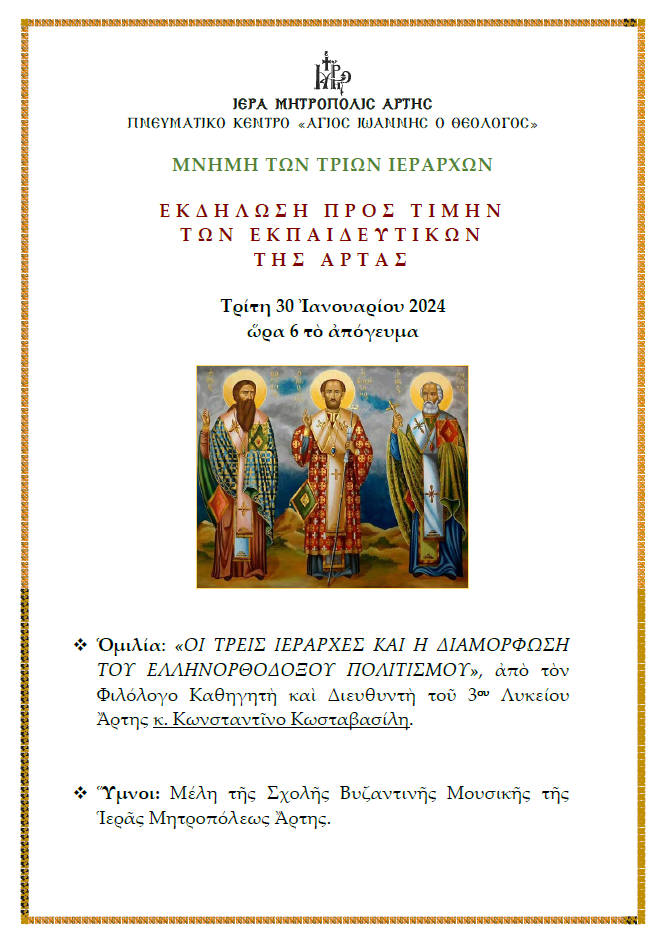 Εκδήλωση για τους Τρεις Ιεράρχες στην Άρτα