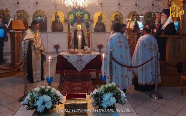 Στον ενοριακό Ιερό Ναό Αγίων Αποστόλων Αμφιθέας Άρτης, όπου φυλάσσεται απότμημα Ιερού Λειψάνου του Αγίου Αθανασίου τελέσθηκε σήμερατο απόγευμα, Τρίτη 17 Ιανουαρίου 2023, Μέγας Εσπερνός, χοροστατούντος του Σεβασμιωτάτου Μητροπολίτου Άρτης κ. Καλλινίκου.