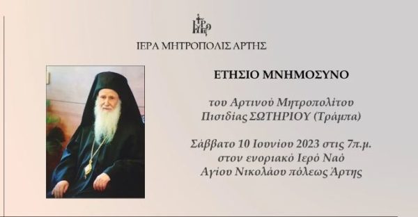 Το προσεχές Σάββατο, 10 Ιουνίου 2023, στον Ιερό Ενοριακό Ναό Αγίου Νικολάου Άρτης θα τελεσθεί το ετήσιο μνημόσυνο του μακαριστού Μητροπολίτη Πισιδίας κυρού Σωτηρίου (Τράμπα).