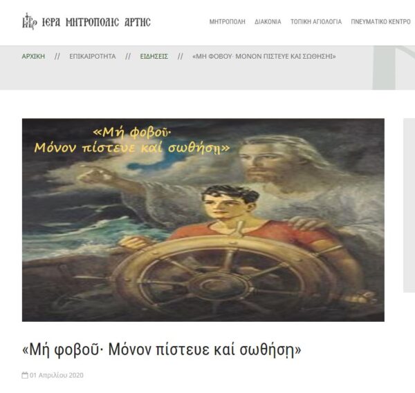 «Μή φοβοῦ∙ Μόνον πίστευε καί σωθήσῃ», αναφέρει το διαδικτυακό μήνυμα της 1ης Απριλίου 2020 της Ιεράς Μητροπόλεως Άρτης, όπως αυτό δημοσιεύεται στην επίσημη ιστοσελίδα της, κατ’ ετούτες τις κρίσιμες ημέρες για την πατρίδα μας και ολόκληρον τον κόσμο, υπό την παγκόσμια απειλή εξαπλώσεως του ιού του κορονοϊού.