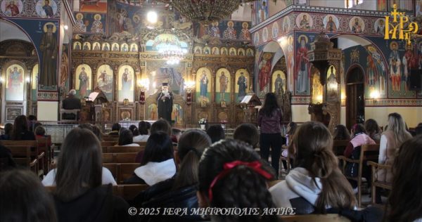 Στο πέρας της Θείας Λειτουργίας, ο Σεβασμιώτατος Μητροπολίτης Άρτης κ. Καλλίνικος μίλησε στους μαθητές, τονίζοντας “εμπνεόμενοι από τον Εσταυρωμένο Ιησού, αγωνιστείτε φιλότιμα“.
