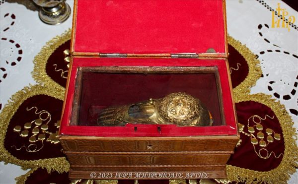 Κατά την Θεία Λειτουργία ετέθη εις προσκύνηση Ιερό Λείψανο του Αγίου Μεγαλομάρτυρος Μερκουρίου.