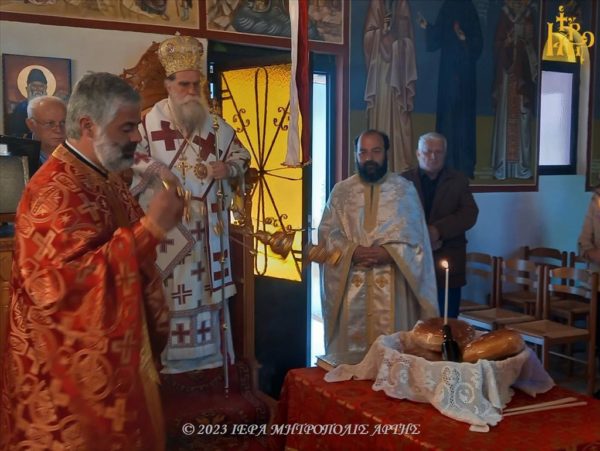 Ο Σεβασμιώτατος Μητροπολίτης Άρτης κ. Καλλίνικος προεξήρχε της Θείας Λειτουργίας στο πανηγυρίζον παρεκκλήσιο των Αγίων Ραφαήλ, Νικολάου και Ειρήνης, Άνω Καλεντίνης (συνοικισμός Πλακουτσαίικα) Άρτης το πρωί της Τρίτης του Πάσχα, 18 Απριλίου 2023.