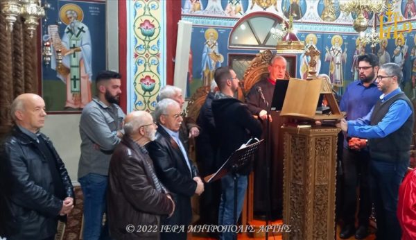 Τα αναλόγια του Ναού πλαισιώθηκαν από τους Ιεροψάλτες του Συνδέσμου Ιεροψαλτών Άρτης, οι οποίοι κάθε χρόνο τιμούν την μνήμη του Αγίου Ιωάννου του Δαμασκηνού.