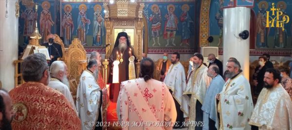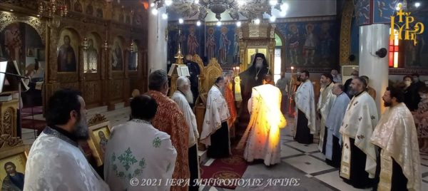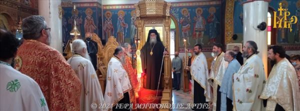Την Πέμπτη 13 Μαΐου 2021, το απόγευμα, στον πανηγυρίζοντα Ενοριακό Ιερό Ναό του Αγίου Θεράποντος, στον οικισμό Αγίων Αναργύρων Άρτης, τελέσθηκε Μέγας Εσπερινός χοροστατούντος του Σεβασμιωτάτου Μητροπολίτου Άρτης κ. Καλλινίκου.
