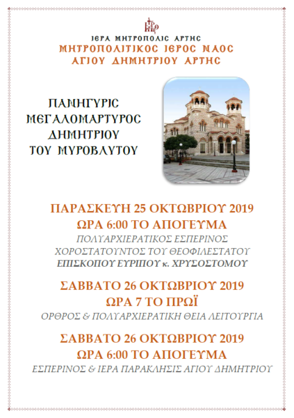 Πανήγυρις Μητροπολιτικού Ναού Άρτης – Κατά την Παρασκευή 25 Οκτωβρίου 2019, θα τελεσθεί Πολυαρχιερατικός Εσπερινός και την επόμενη, Σάββατο 26 Οκτωβρίου 2019, Πολυαρχιερατική Θεία Λειτουργία, συμφώνως με το κάτωθι επισυναφθέν Πρόγραμμα Πανηγύρεως: