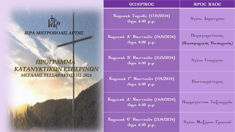Η Ιερά Μητρόπολη Άρτης ανακοινώνει το πρόγραμμα των Κατανυκτικών Εσπερινών της Μεγάλης Τεσσαρακοστής το οποίο έχει ως εξής: