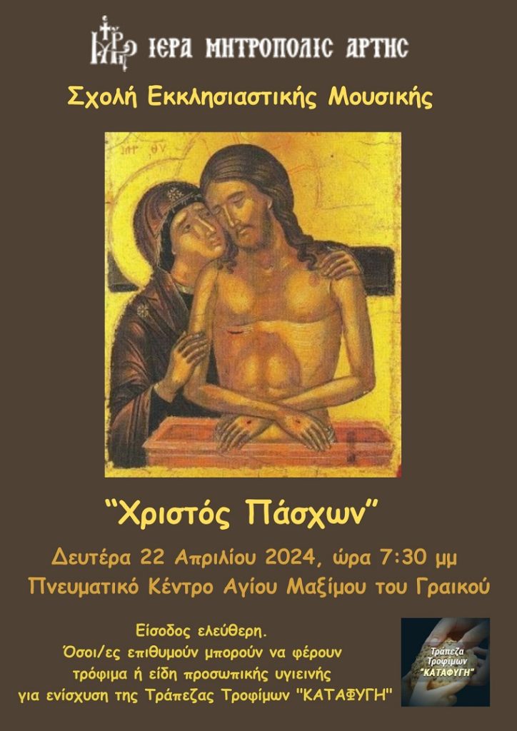 H Σχολή Εκκλησιαστικής Μουσικής της Ιεράς Μητροπόλεως Άρτης σας προσκαλεί την Δευτέρα 22 Απριλίου 2024 στις 7:30 το απόγευμα, στην εκδήλωση με τίτλο: «Χριστός Πάσχων».