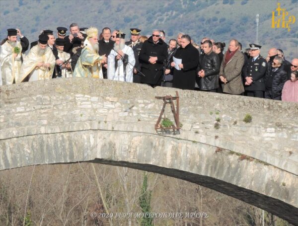 Στη συνέχεια, από το Θρυλικό Γεφύρι της Άρτας, ο Σεβασμιώτατος ετέλεσε την καθιερωμένη κατάδυση του Τιμίου Σταυρού, στον Άραχθο ποταμό. Στο μήνυμά του, ο Σεβασμιώτατος ετόνισε ότι, το Άγιο Πνεύμα, που φανερώθηκε στον Ιορδάνη εν «είδει περιστεράς», χαρίζει ειρήνη στις ψυχές μας και στον κόσμο.