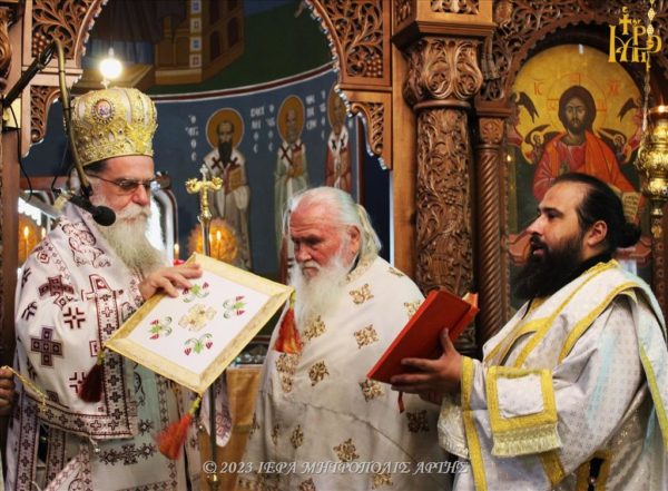Στο πέρας της Θείας Λειτουργίας, ο Σεβασμιώτατος απένειμε το οφφίκιο του Πρωτοπρεσβυτέρου στον Ιερέα Βασίλειο Τσίρκα, ως αναγνώριση, όχι μόνο της ιεροπρεπούς αναστροφής του προχειρισθέντος Ιερέως, αλλά και της καθοριστικής συμβολής του, στην προσφάτως ολοκληρωθείσα αγιογράφηση του Ιερού Ναού Γενεθλίου της Θεοτόκου, της Ιεράς Μονής Μελατών Άρτης.