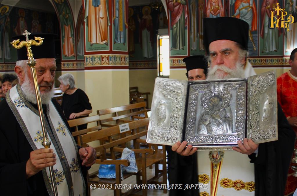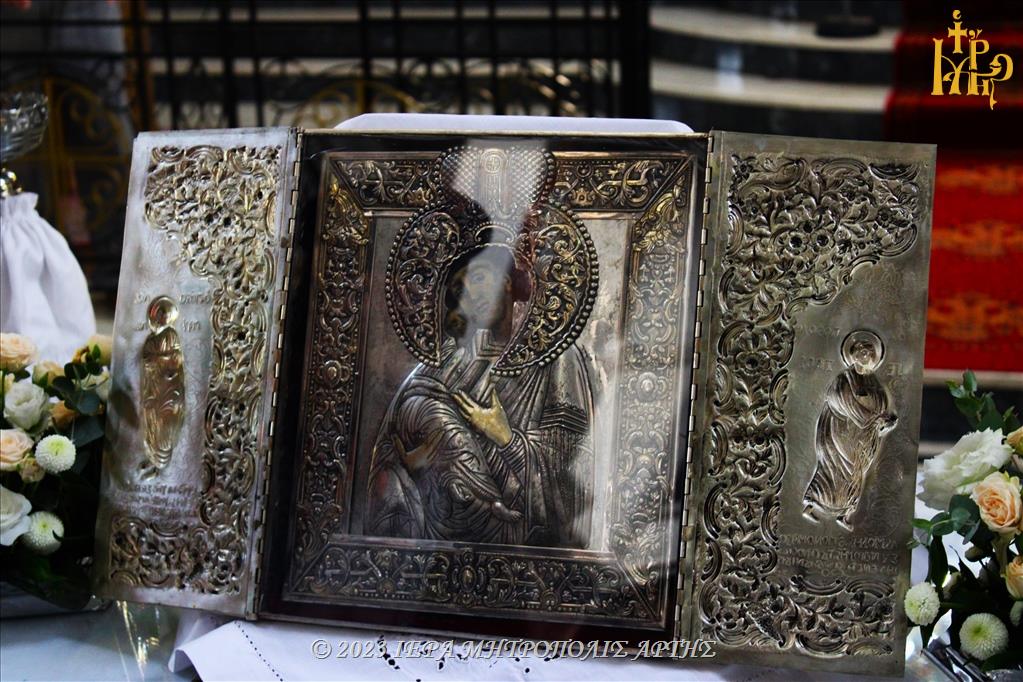 Η θαυματουργή εικόνα της Υπεραγίας Θεοτόκου, της “Κυράς της ορεινής Άρτας“, όπως την αποκαλεί ο λαός, θα παραμείνει προς προσκύνηση στον ενοριακό Ιερό Ναό του Αγίου Γεωργίου Κομποτίου για λίγες ημέρες, οπότε θα επιστρέψει στην Ιερά Μονή Παναγίας της Ροβελίστης.