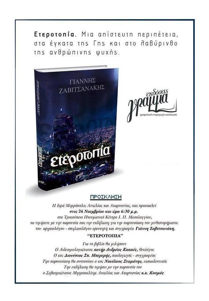 Η Ιερά Μητρόπολις Αιτωλίας και Ακαρνανίας ανακοινώνει ότι την προσεχή Δευτέρα 26 Νοεμβρίου 2018 και ώρα 18:30’, στην αίθουσα εκδηλώσεων του Τρικούπειου Πνευματικού Κέντρου της Ιεράς Πόλεως Μεσολογγίου, θα πραγματοποιηθεί η παρουσίαση του μυθιστορήματος του σπηλαιολόγου – ερευνητή και συγγραφέα κ. Ιωάννη Ζαβιτσανάκη.