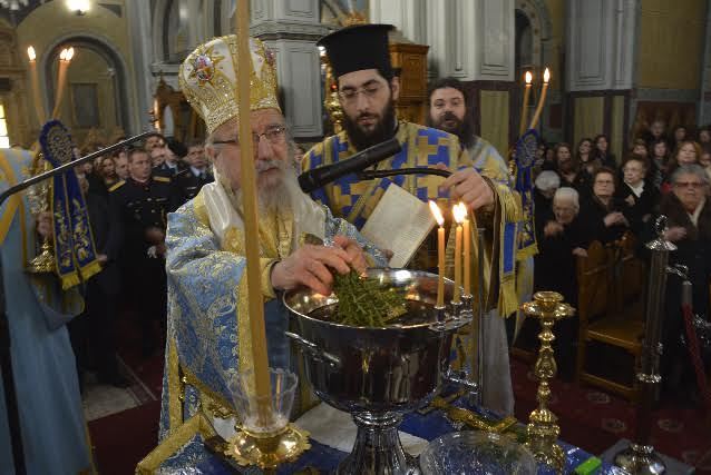 Ο Σεβασμιώτατος τέλεσε στη συνέχεια την ακολουθία του Μεγάλου Αγιασμού, παρουσία των αρχών της Ιεράς Πόλεως και ακολούθως άπαντες με λιτανευτική πομπή μετέβησαν στο λιμάνι της Ιεράς Πόλεως, όπου ο Σεβασμιώτατος, από ειδικά διαμορφωμένη εξέδρα τέλεσε την ακολουθία του αγιασμού των υδάτων ρίχνοντας τον Τίμιο Σταυρό στη θάλασσα.